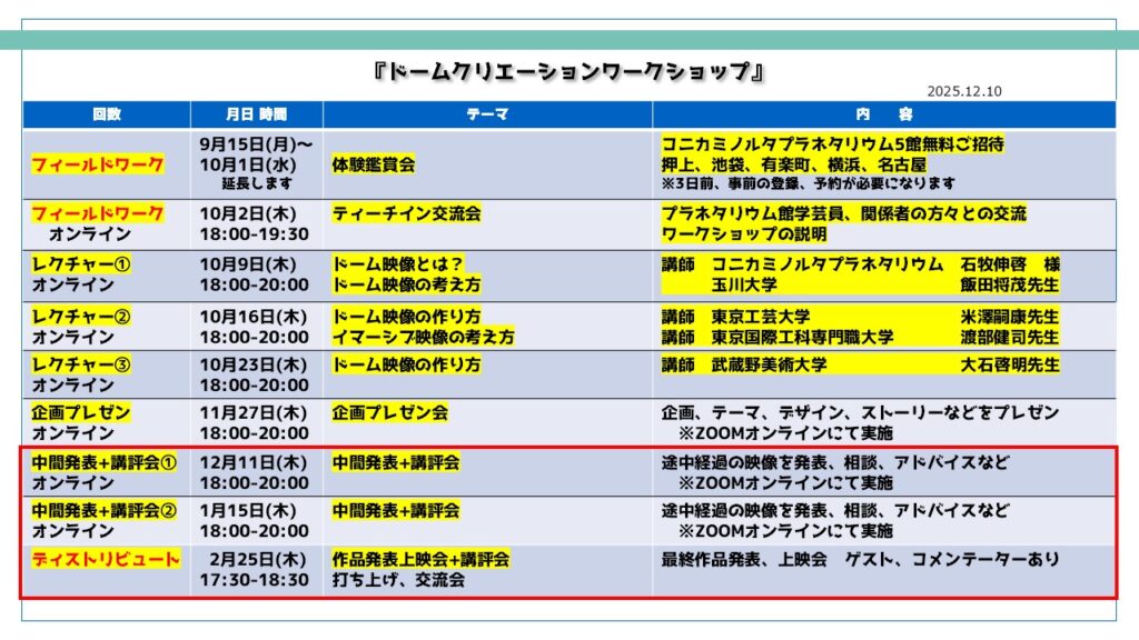 2025年9月から始まったワークショップ。特徴としてはフィールドワーク、レクチャー、クリエイション、ディストリビューションの4つからなる構成。実際のプラネタリウムでの鑑賞体験、大学の先生方によるレクチャー、実際の作品制作と中間のプレゼン、講評会。作品発表上映会になります。